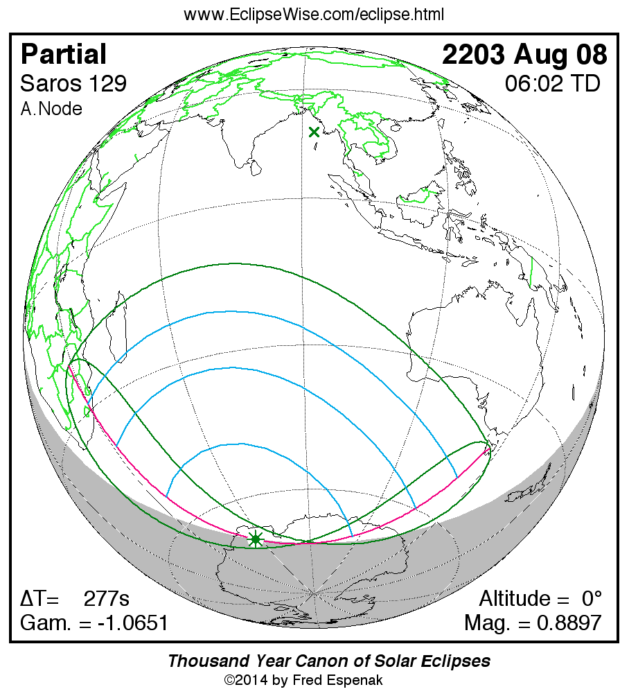 The instant of greatest eclipse takes place on 2203 Aug 08 at 06:01:56 TD (05:57:19 UT1).
