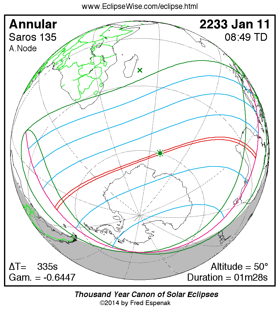 The instant of greatest eclipse takes place on 2233 Jan 11 at 08:49:17 TD (08:43:42 UT1).