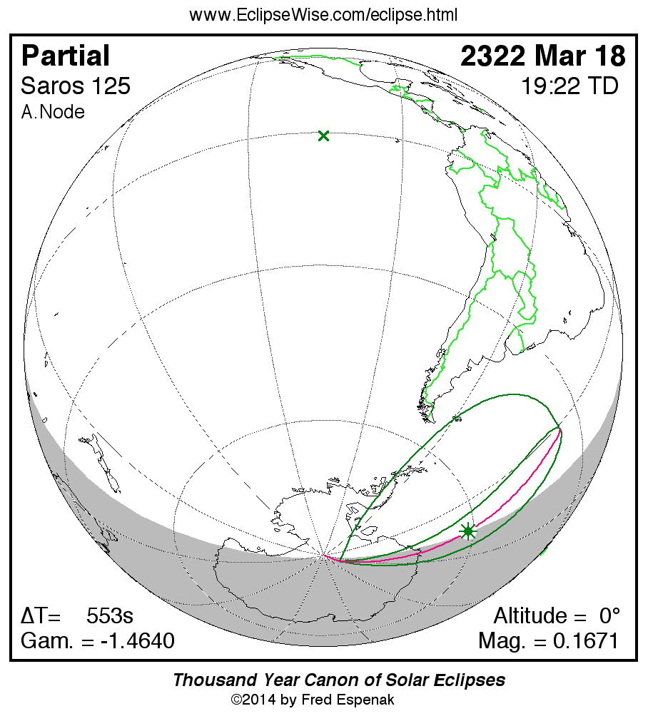 The instant of greatest eclipse takes place on 2322 Mar 18 at 19:21:51 TD (19:12:38 UT1).