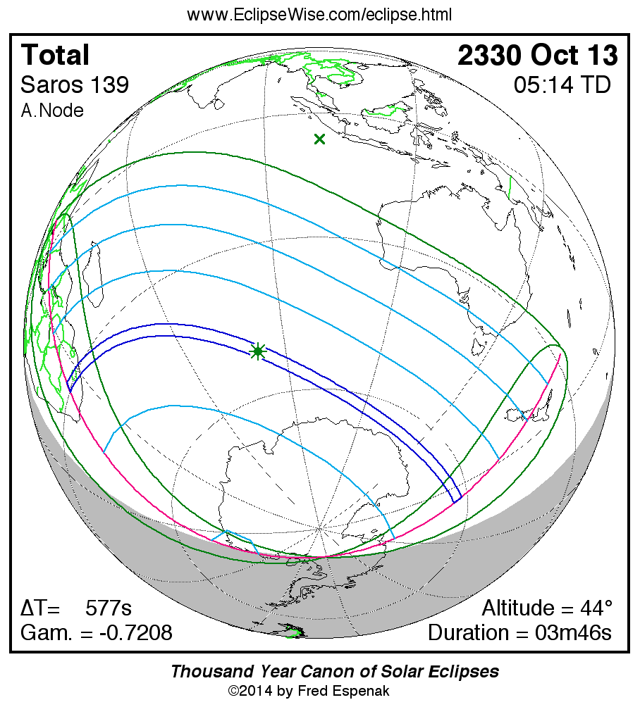 The instant of greatest eclipse takes place on 2330 Oct 13 at 05:13:41 TD (05:04:04 UT1).
