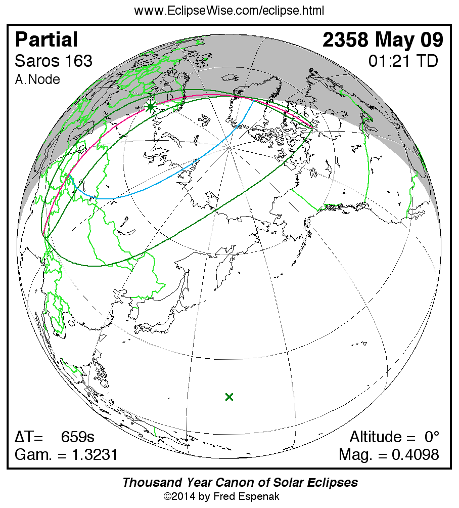 The instant of greatest eclipse takes place on 2358 May 09 at 01:21:14 TD (01:10:15 UT1).