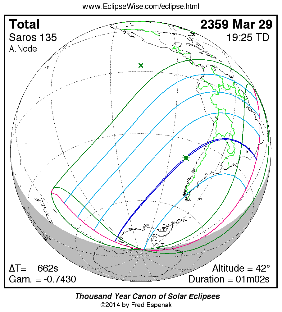 The instant of greatest eclipse takes place on 2359 Mar 29 at 19:24:46 TD (19:13:44 UT1).
