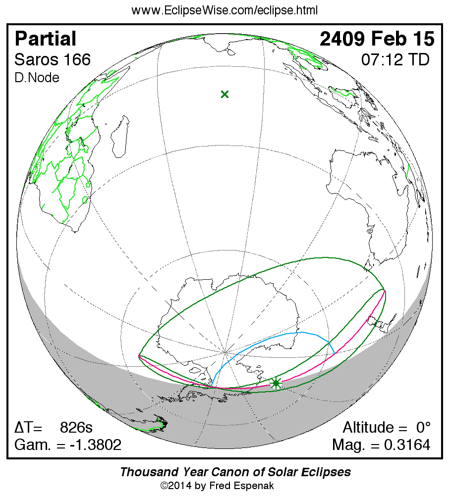The instant of greatest eclipse takes place on 2409 Feb 15 at 07:12:29 TD (06:58:43 UT1).