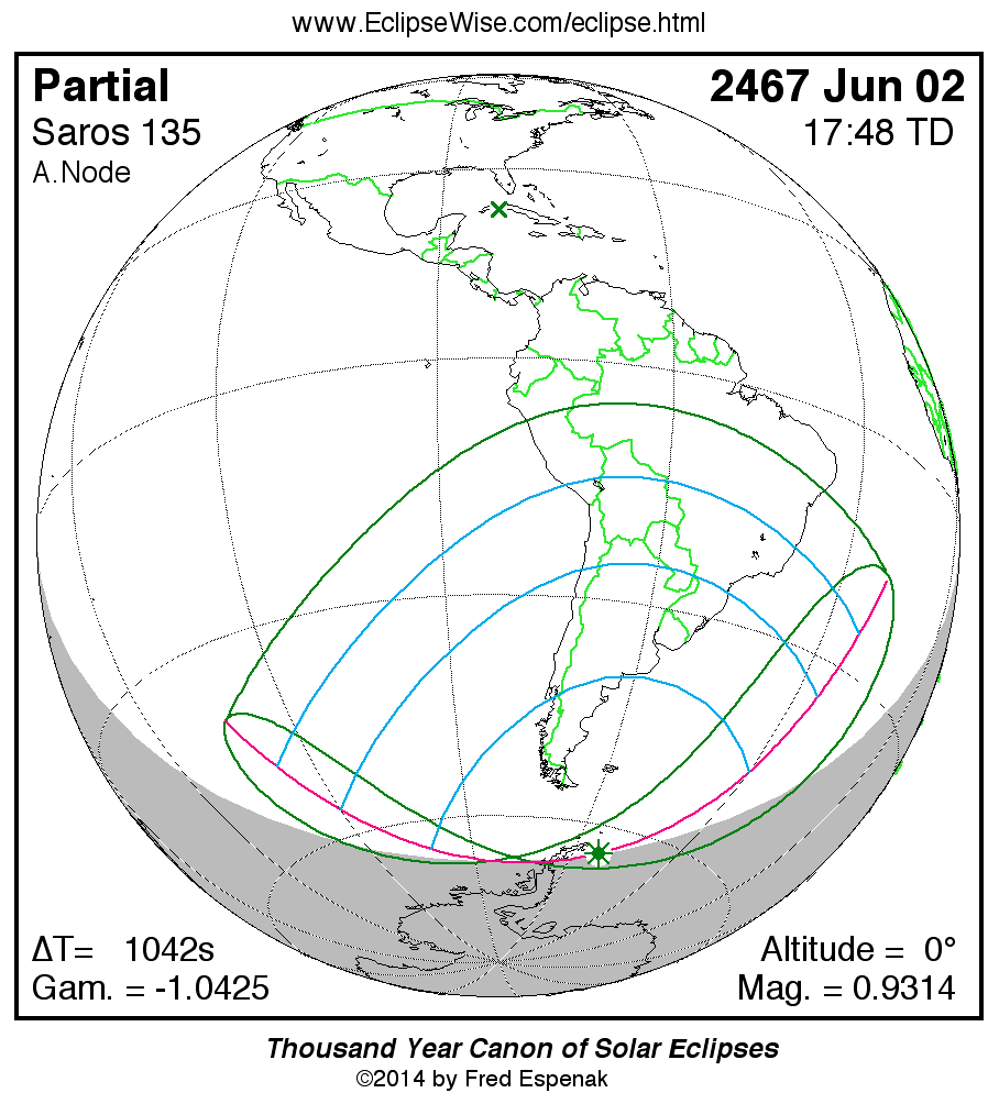 The instant of greatest eclipse takes place on 2467 Jun 02 at 17:48:23 TD (17:31:01 UT1).