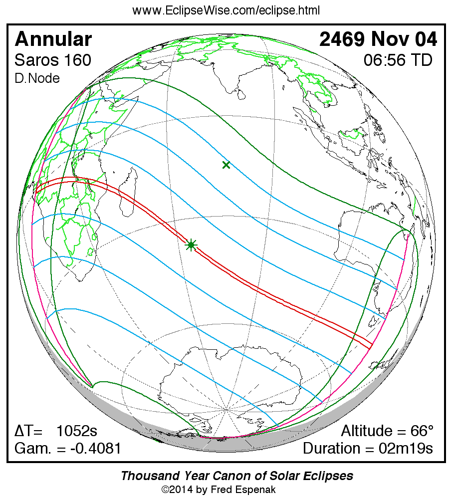 The instant of greatest eclipse takes place on 2469 Nov 04 at 06:55:36 TD (06:38:04 UT1).