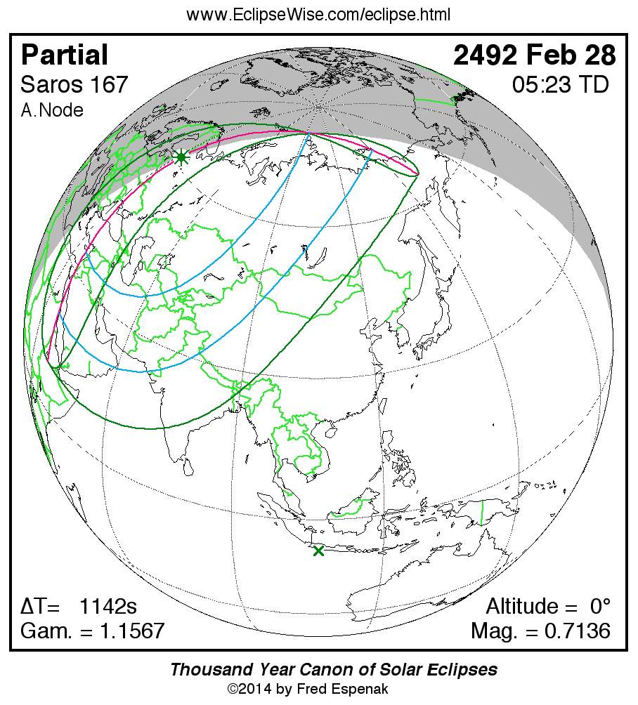 The instant of greatest eclipse takes place on 2492 Feb 28 at 05:22:52 TD (05:03:50 UT1).