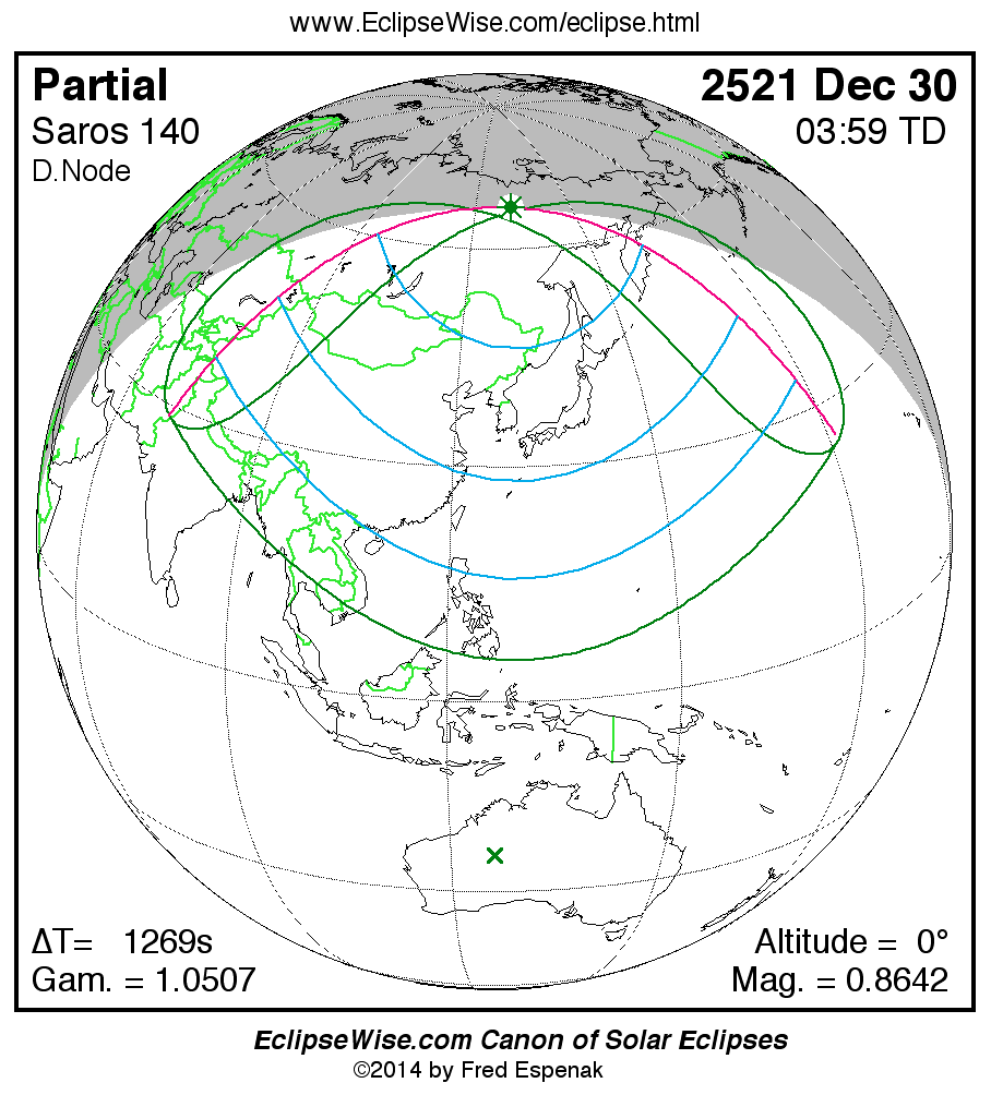 The instant of greatest eclipse takes place on 2521 Dec 30 at 03:58:49 TD (03:37:40 UT1).