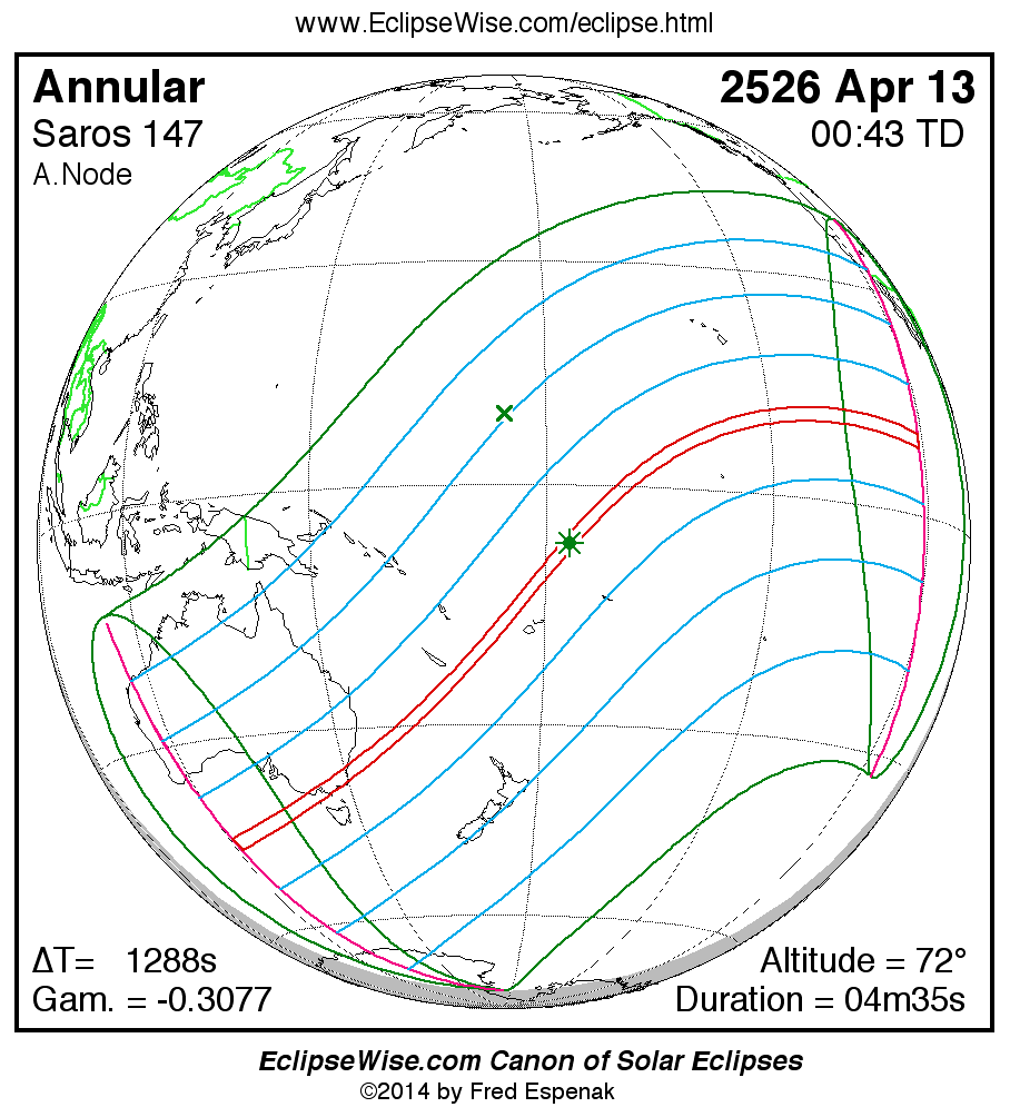 The instant of greatest eclipse takes place on 2526 Apr 13 at 00:43:01 TD (00:21:33 UT1).