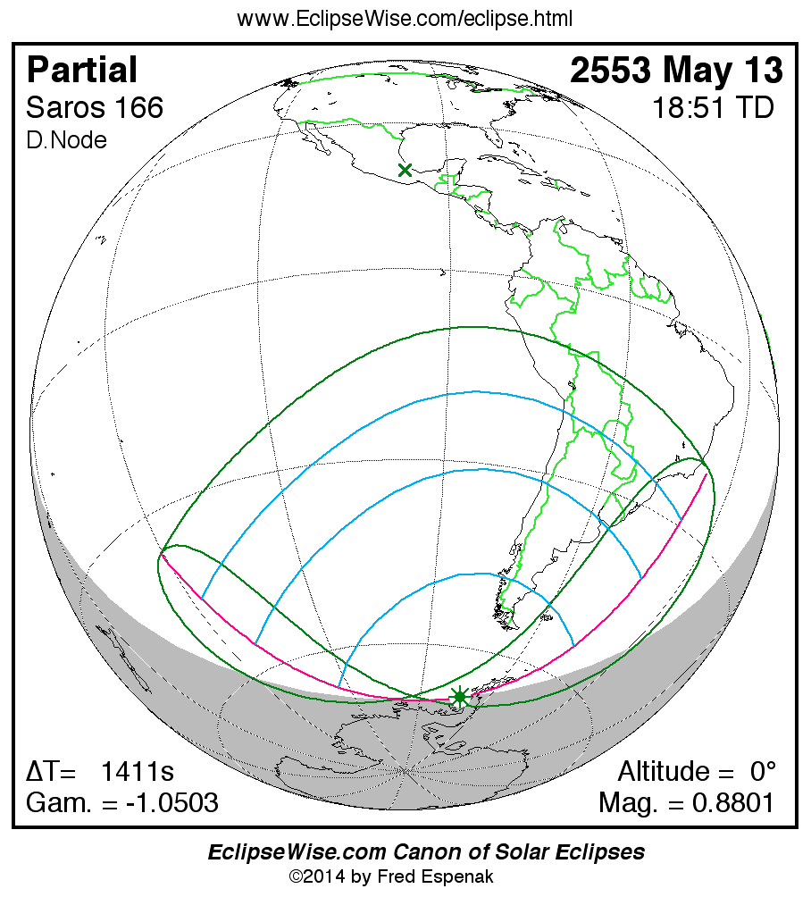 The partial solar eclipse of 2553 May 13 is preceded two weeks earlier by a total lunar eclipse on 2553 Apr 29.