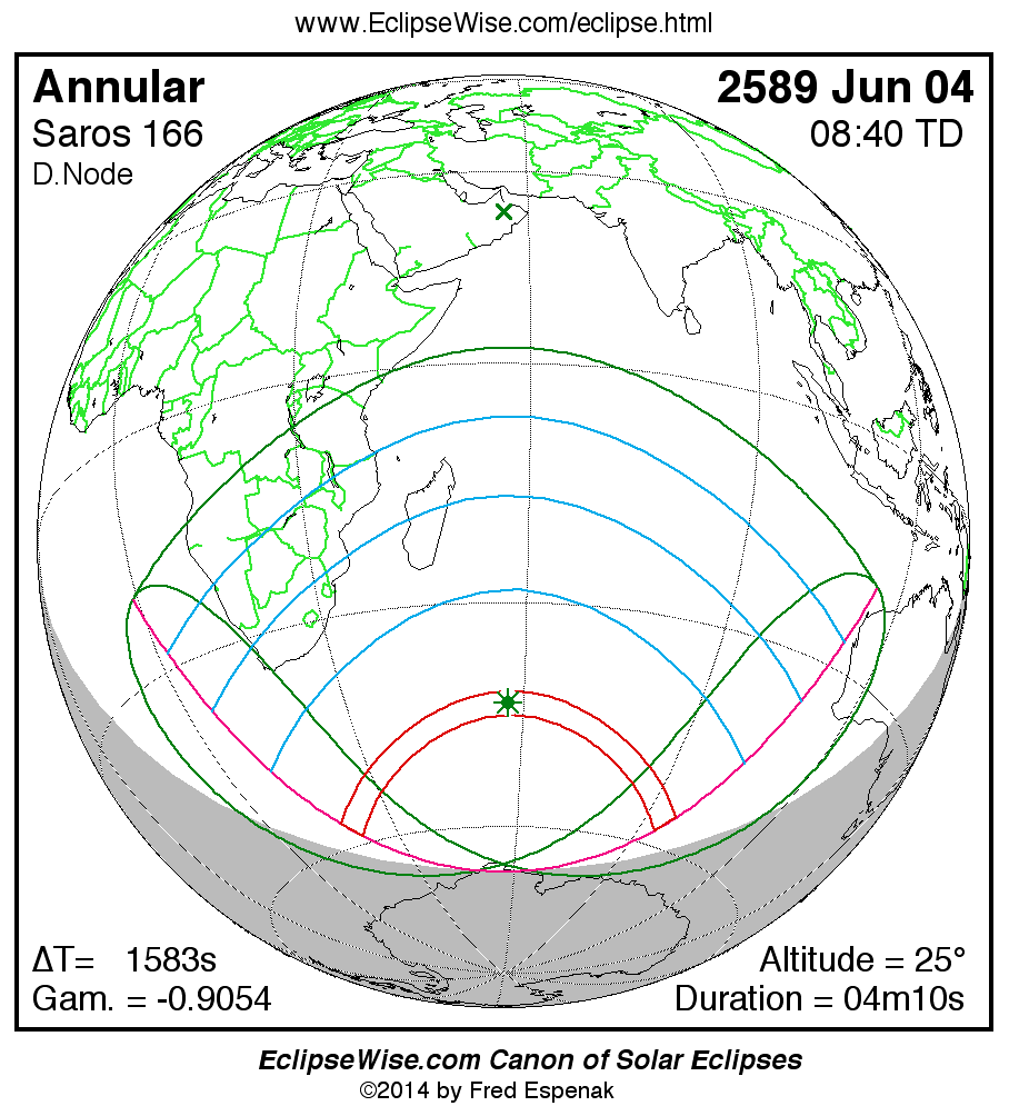 The instant of greatest eclipse takes place on 2589 Jun 04 at 08:40:21 TD (08:13:59 UT1).