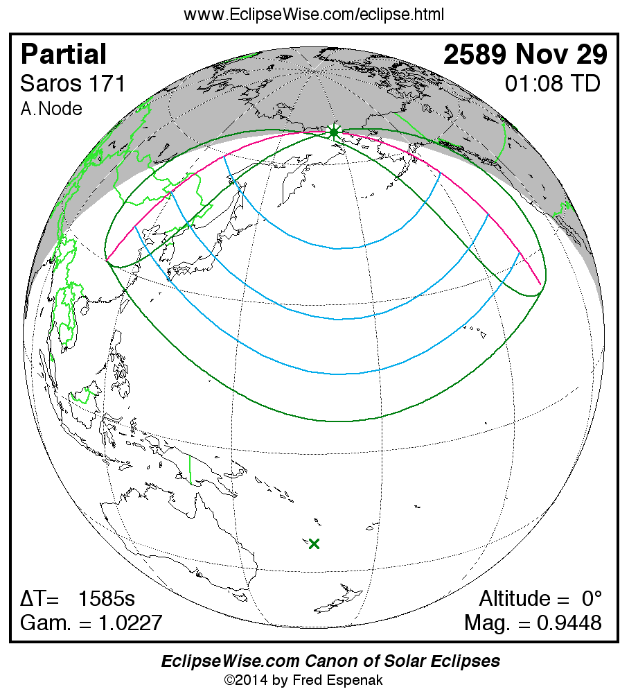 The instant of greatest eclipse takes place on 2589 Nov 29 at 01:08:08 TD (00:41:43 UT1).