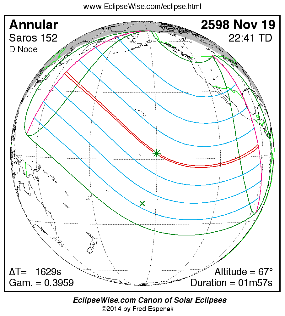 The instant of greatest eclipse takes place on 2598 Nov 19 at 22:41:01 TD (22:13:51 UT1).