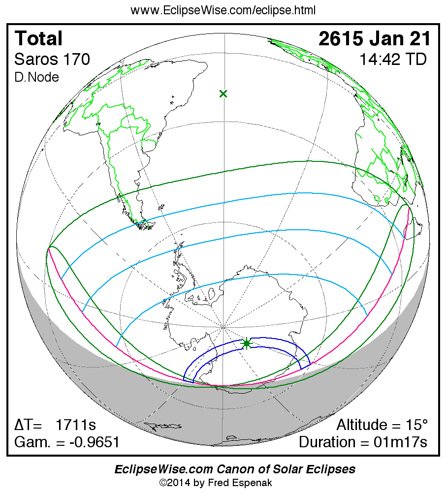 The instant of greatest eclipse takes place on 2615 Jan 21 at 14:41:60 TD (14:13:29 UT1).