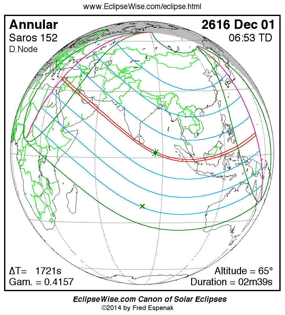 The instant of greatest eclipse takes place on 2616 Dec 01 at 06:53:16 TD (06:24:36 UT1).