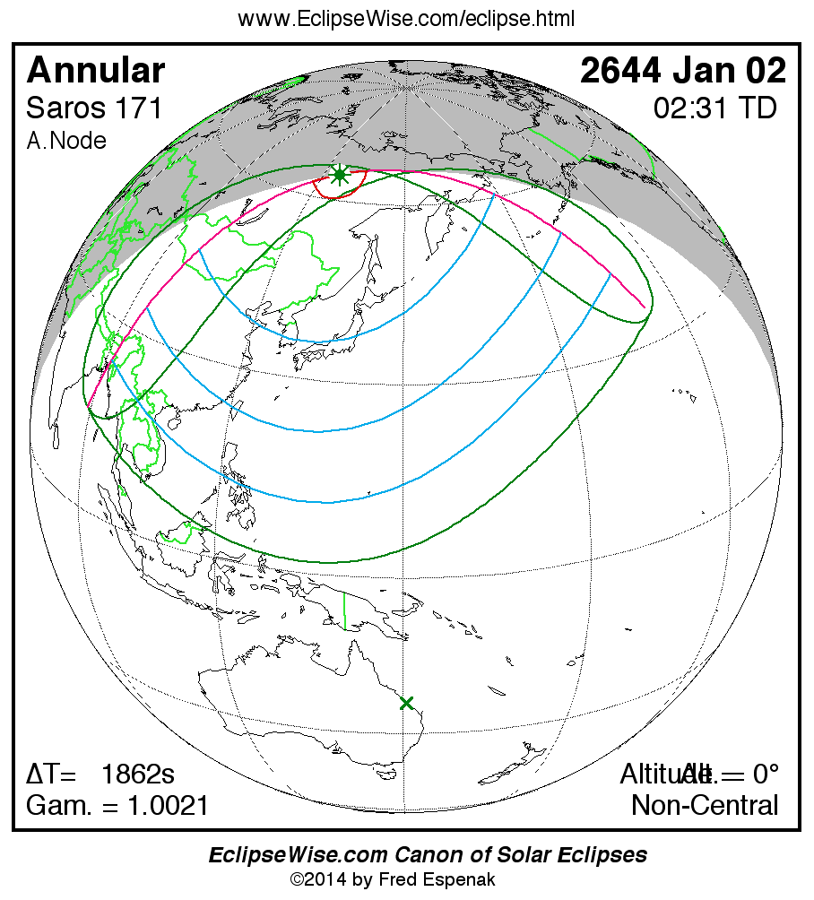 The instant of greatest eclipse takes place on 2644 Jan 02 at 02:31:04 TD (02:00:02 UT1).