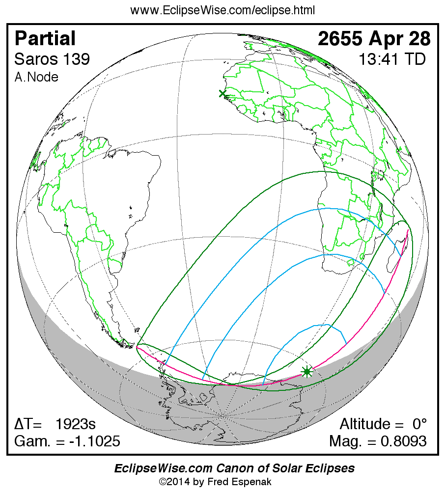The instant of greatest eclipse takes place on 2655 Apr 28 at 13:40:53 TD (13:08:50 UT1).