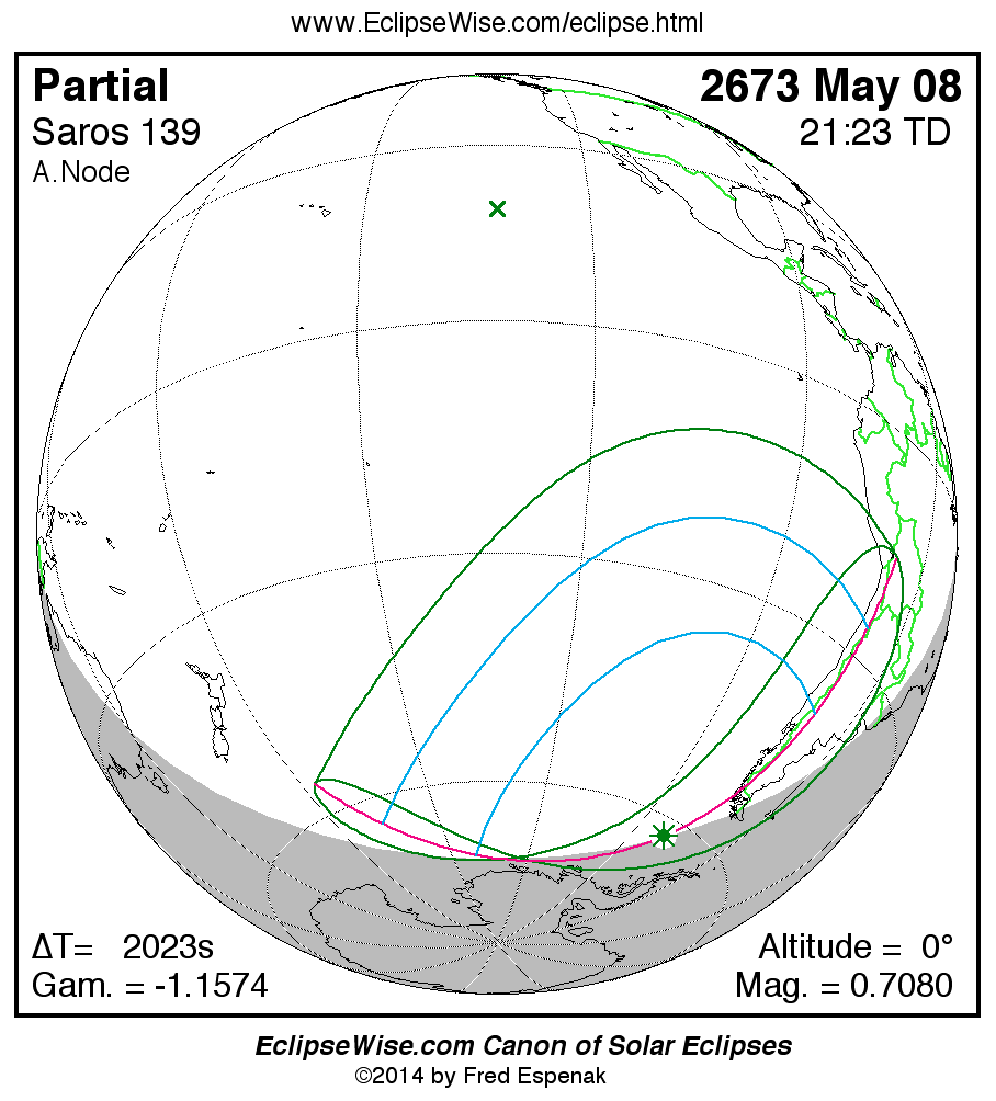 The instant of greatest eclipse takes place on 2673 May 08 at 21:23:20 TD (20:49:38 UT1).