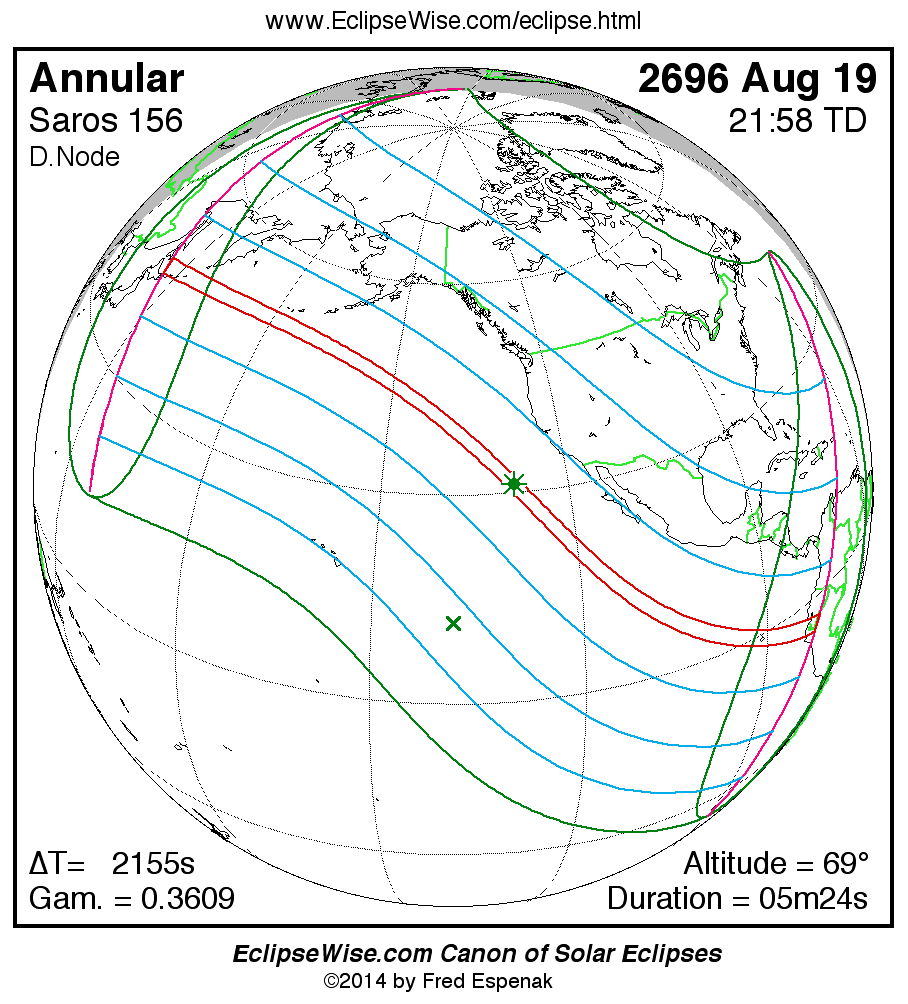 The instant of greatest eclipse takes place on 2696 Aug 19 at 21:57:53 TD (21:21:59 UT1).