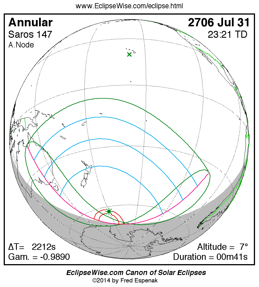 The instant of greatest eclipse takes place on 2706 Jul 31 at 23:20:36 TD (22:43:43 UT1).