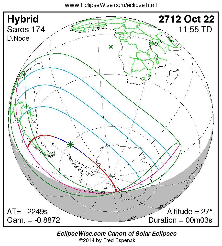 - Orthographic Map: Hybrid Solar Eclipse of 2712 Oct 22 - global map of eclipse visibility