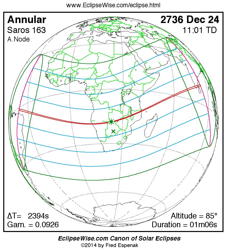 The instant of greatest eclipse takes place on 2736 Dec 24 at 11:00:54 TD (10:21:00 UT1).