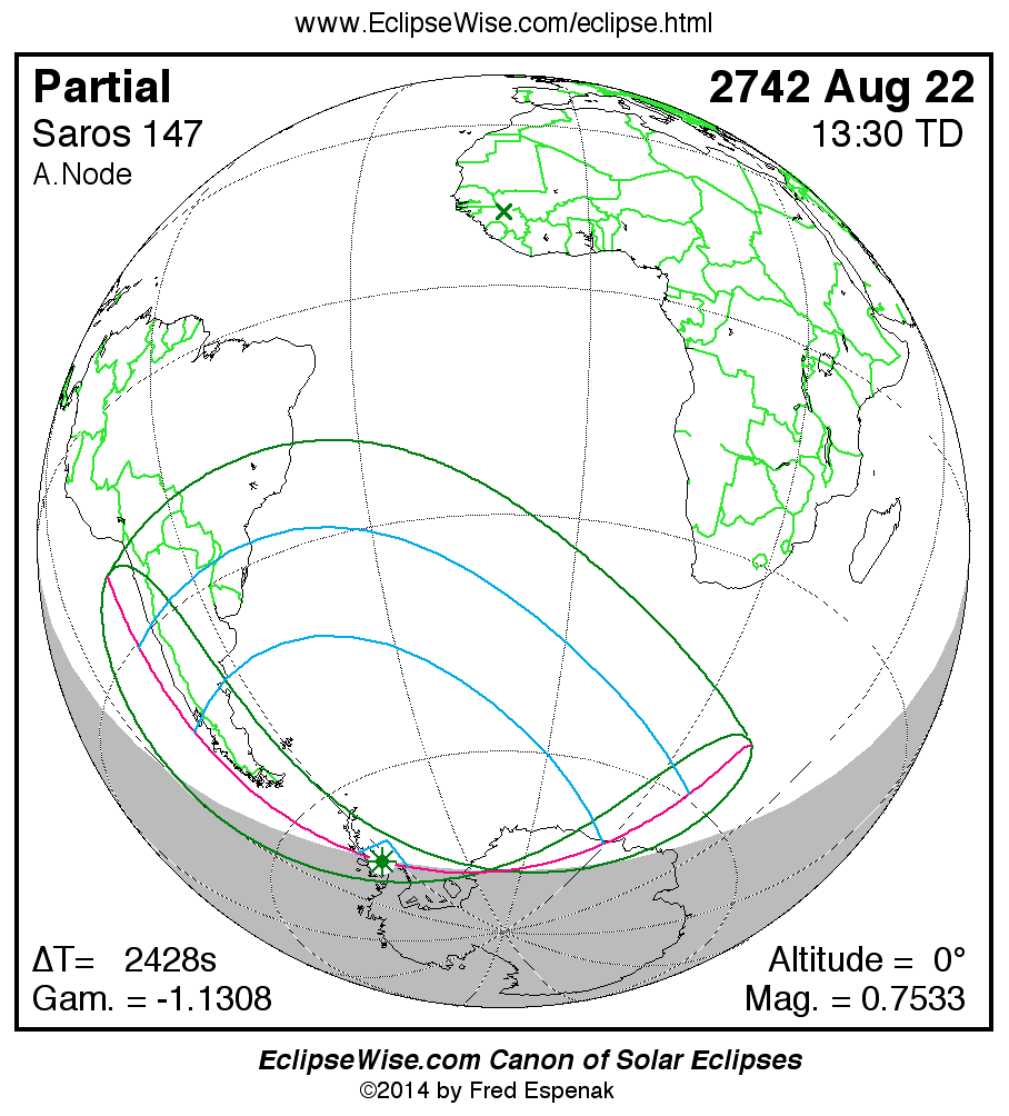 The instant of greatest eclipse takes place on 2742 Aug 22 at 13:29:52 TD (12:49:24 UT1).