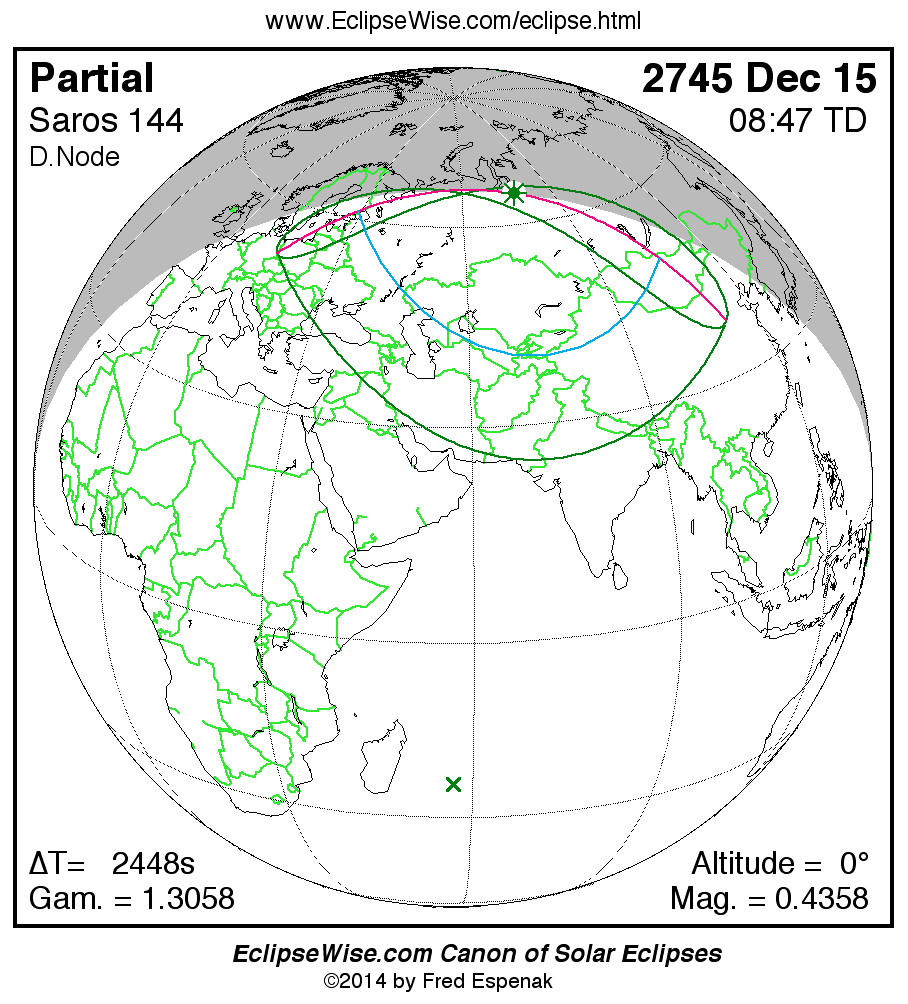 The instant of greatest eclipse takes place on 2745 Dec 15 at 08:47:05 TD (08:06:17 UT1).