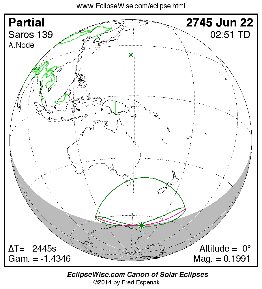 The instant of greatest eclipse takes place on 2745 Jun 22 at 02:51:27 TD (02:10:42 UT1).