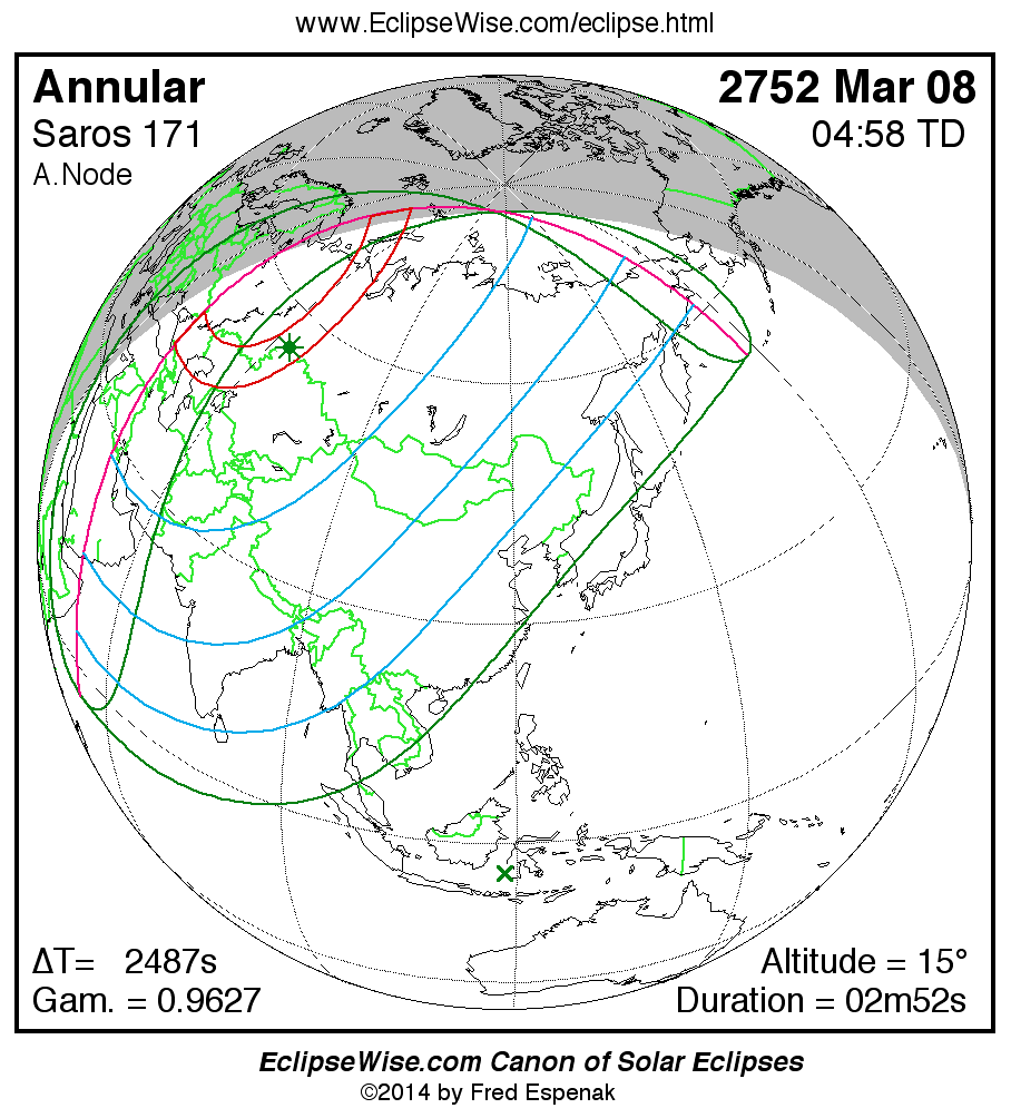The instant of greatest eclipse takes place on 2752 Mar 08 at 04:57:51 TD (04:16:24 UT1).