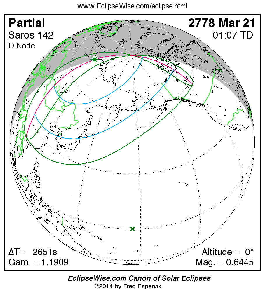 The instant of greatest eclipse takes place on 2778 Mar 21 at 01:06:34 TD (00:22:23 UT1).