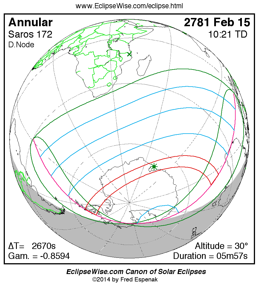 The instant of greatest eclipse takes place on 2781 Feb 15 at 10:20:47 TD (09:36:18 UT1).