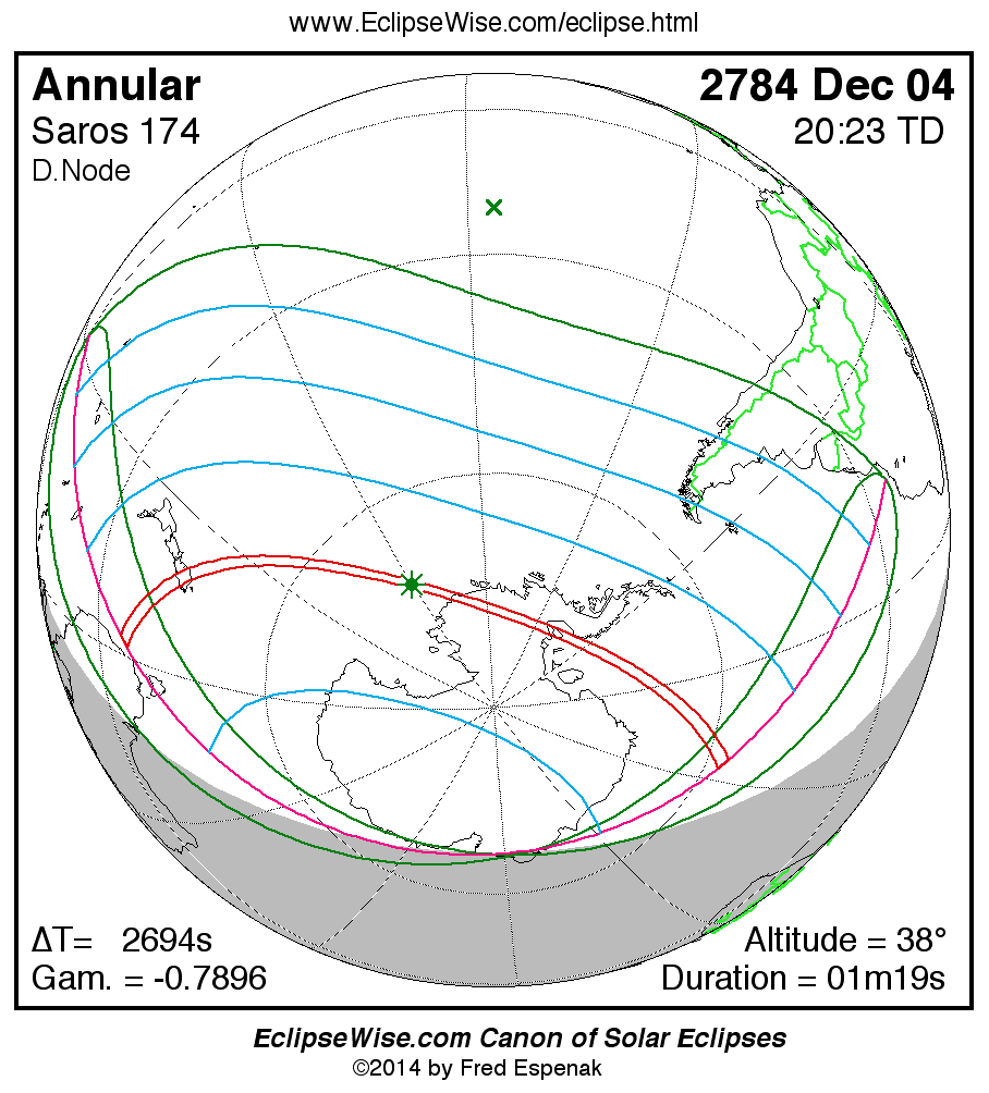 The instant of greatest eclipse takes place on 2784 Dec 04 at 20:23:15 TD (19:38:21 UT1).