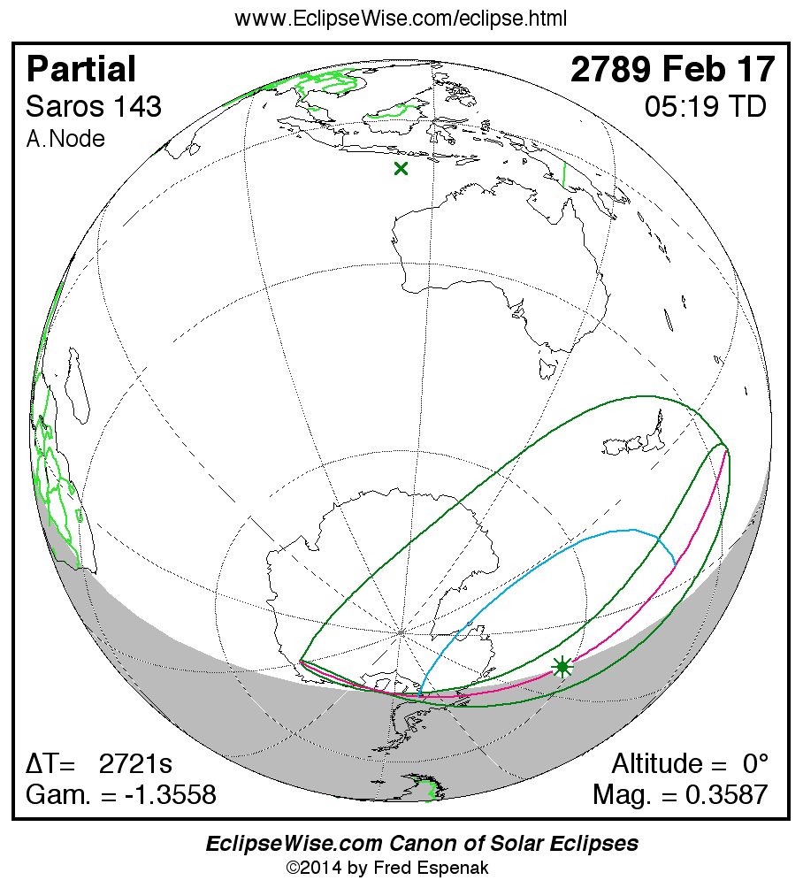 The instant of greatest eclipse takes place on 2789 Feb 17 at 05:19:14 TD (04:33:53 UT1).
