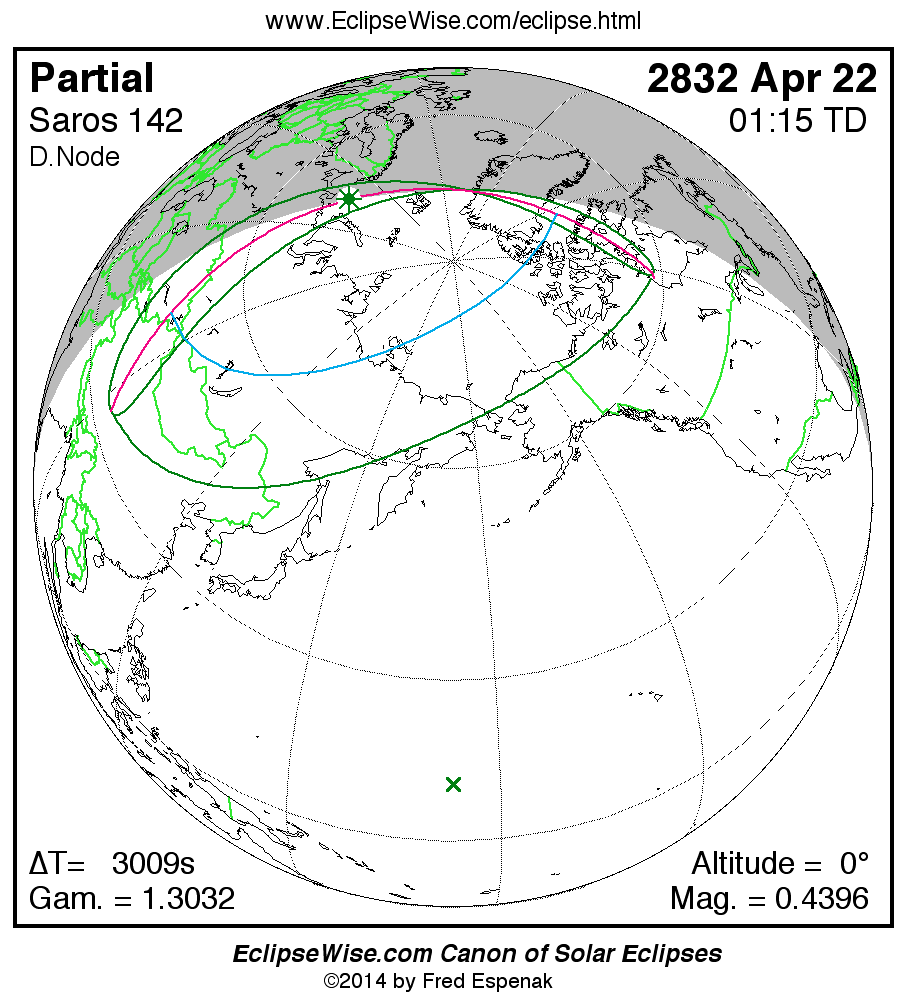 The instant of greatest eclipse takes place on 2832 Apr 22 at 01:15:27 TD (00:25:18 UT1).