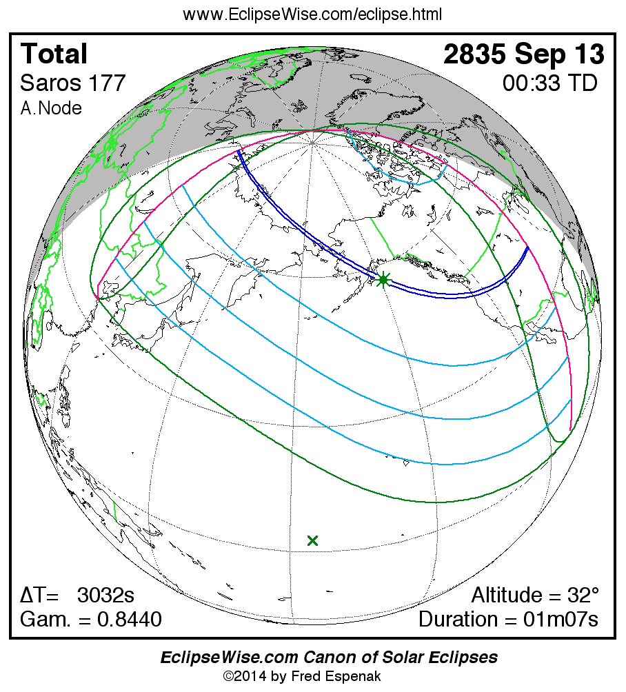 The instant of greatest eclipse takes place on 2835 Sep 14 at 00:33:14 TD (23:42:42 UT1).