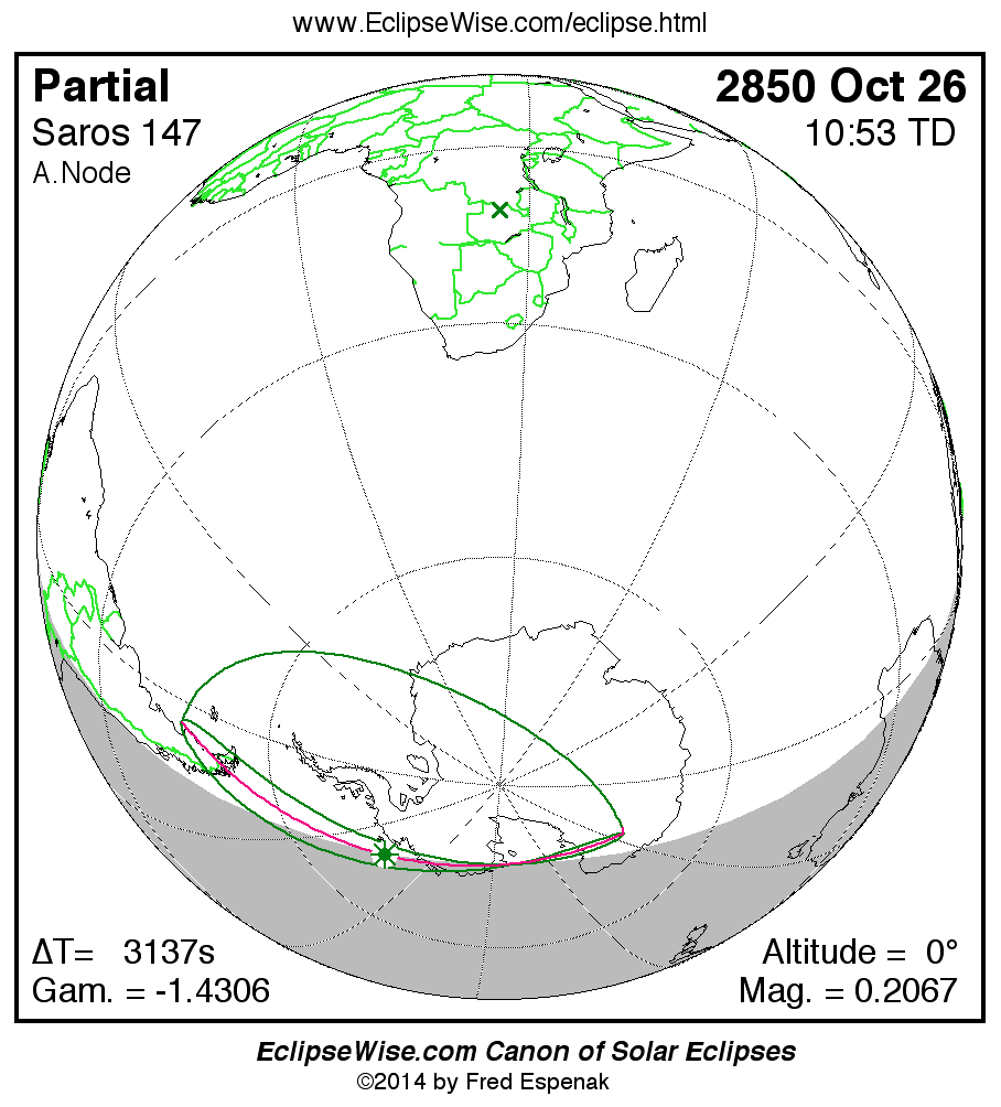 The instant of greatest eclipse takes place on 2850 Oct 26 at 10:52:44 TD (10:00:27 UT1).