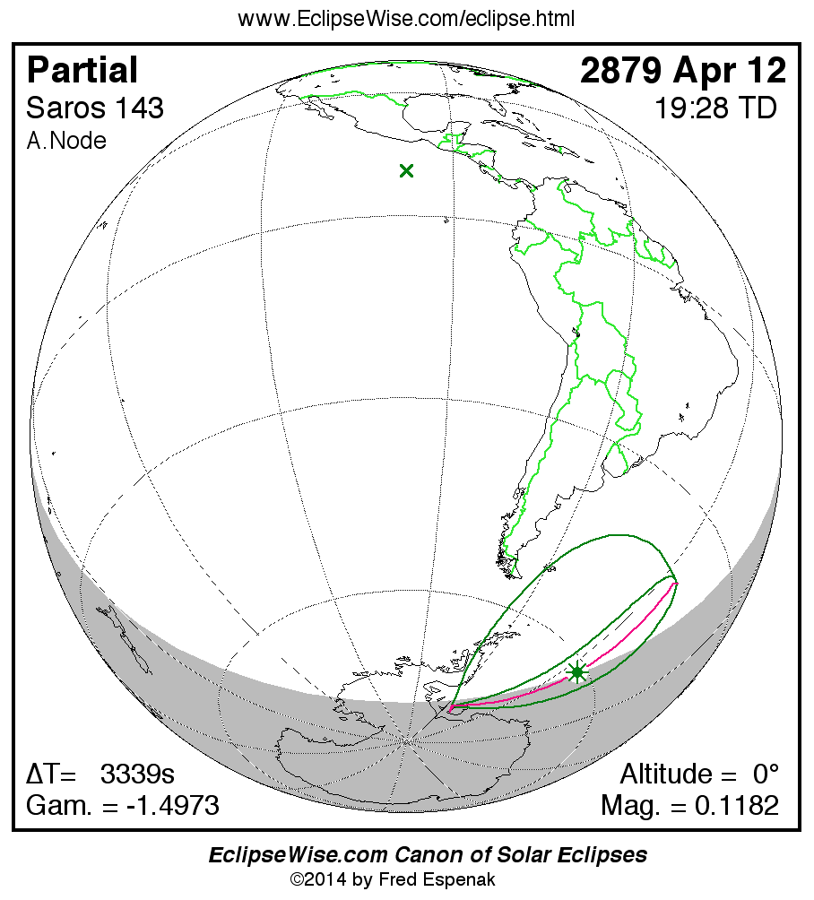 The instant of greatest eclipse takes place on 2879 Apr 12 at 19:28:24 TD (18:32:45 UT1).