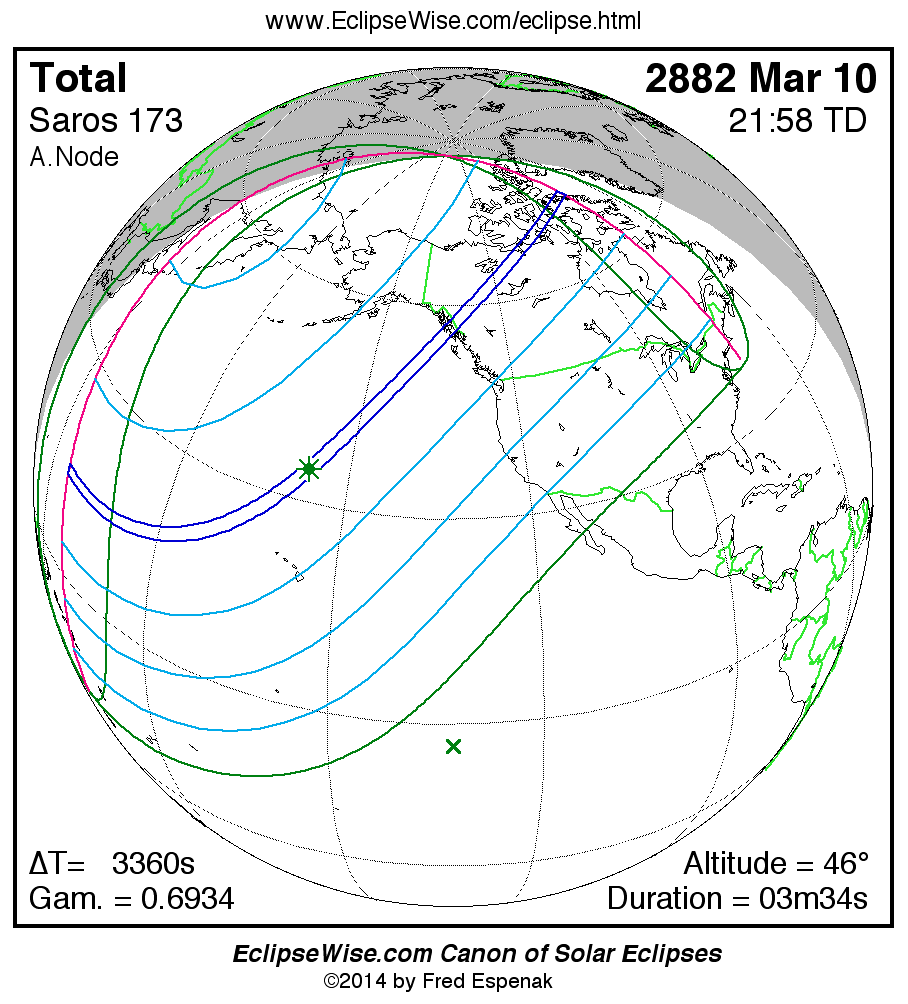The instant of greatest eclipse takes place on 2882 Mar 10 at 21:58:27 TD (21:02:27 UT1).