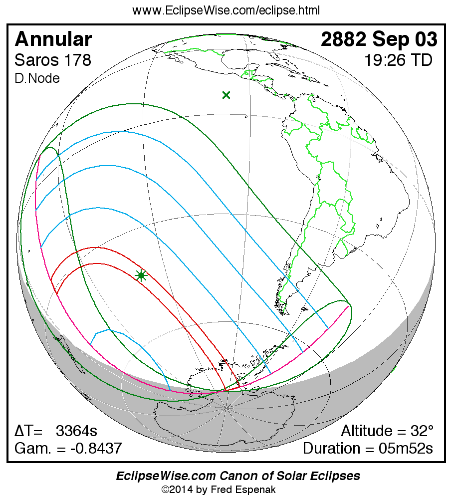 The instant of greatest eclipse takes place on 2882 Sep 03 at 19:25:34 TD (18:29:30 UT1).