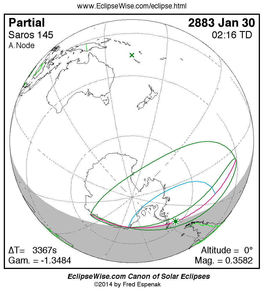 The instant of greatest eclipse takes place on 2883 Jan 30 at 02:15:36 TD (01:19:30 UT1).