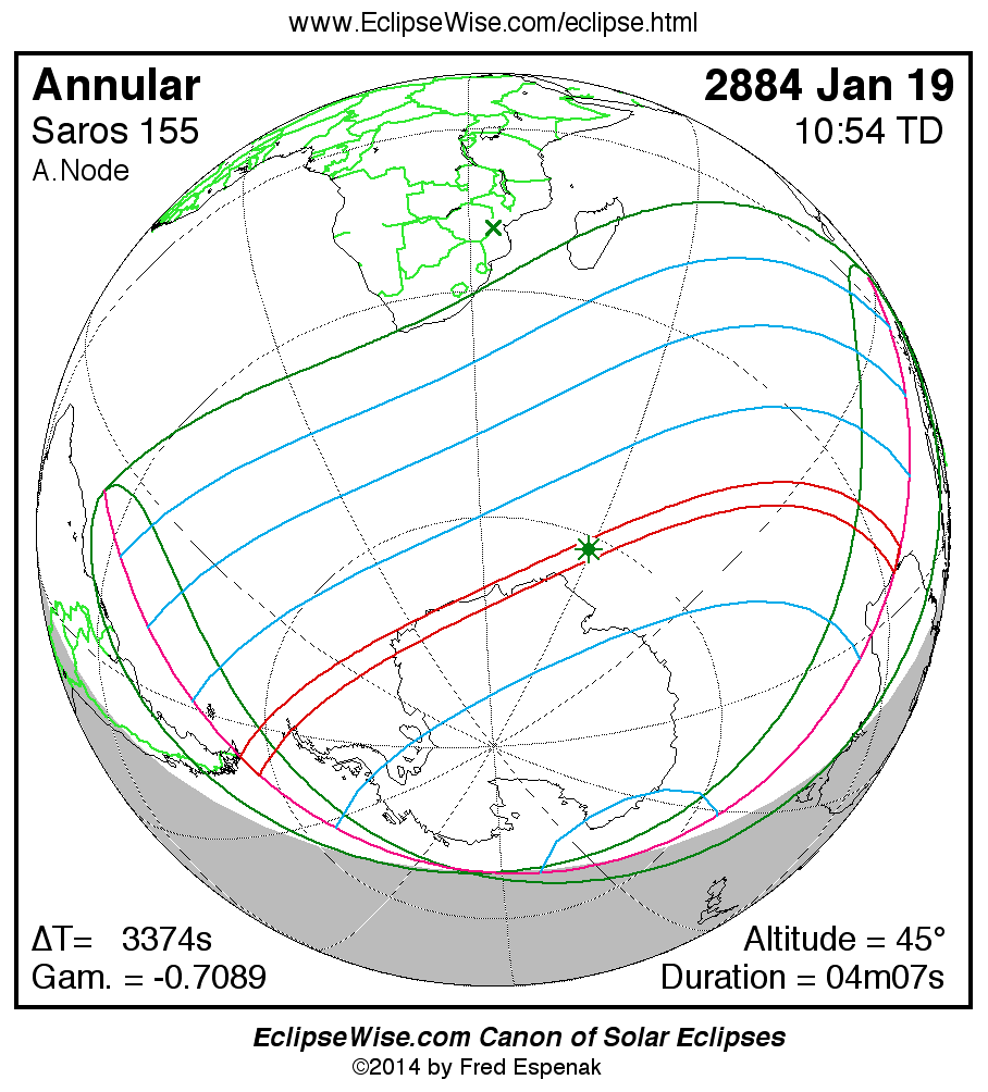 The instant of greatest eclipse takes place on 2884 Jan 19 at 10:53:48 TD (09:57:35 UT1).