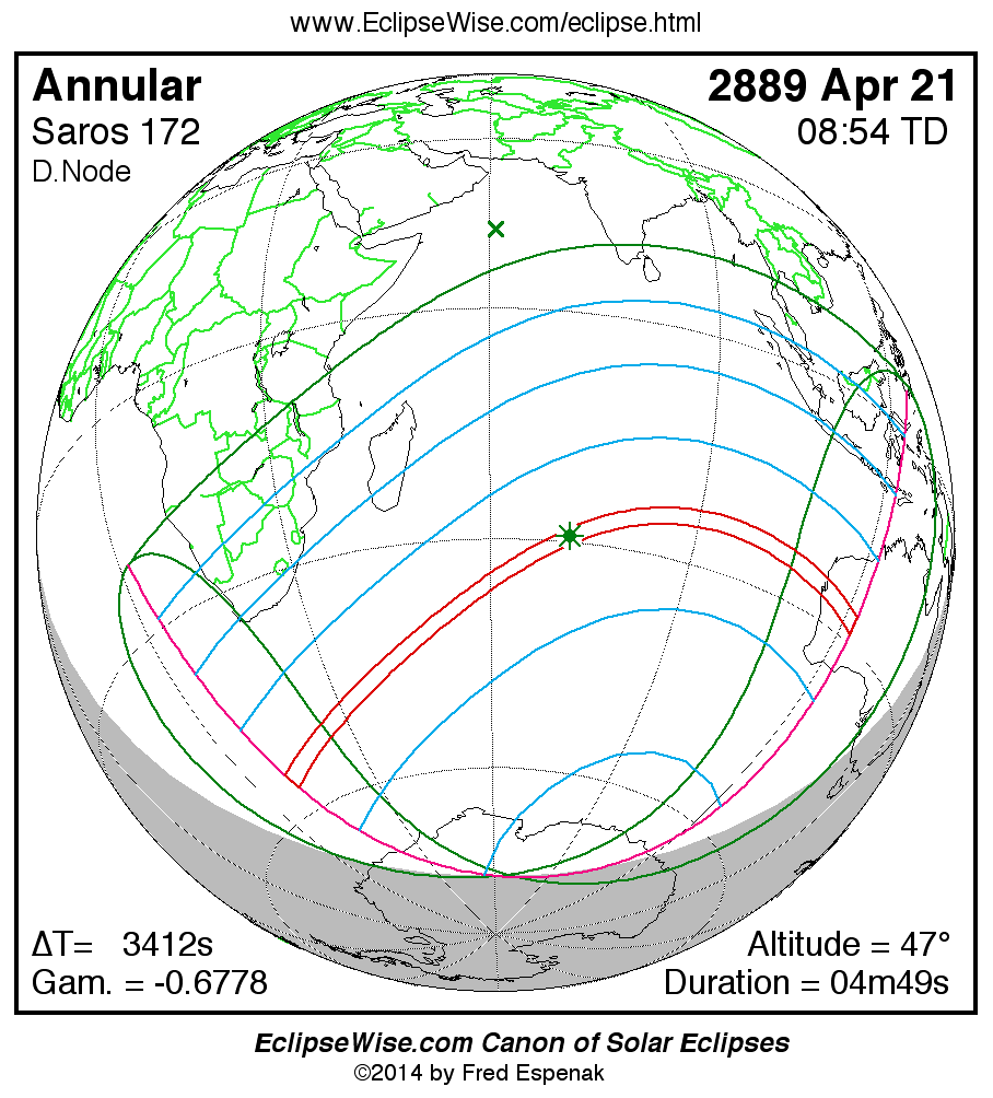 The instant of greatest eclipse takes place on 2889 Apr 21 at 08:53:51 TD (07:56:59 UT1).