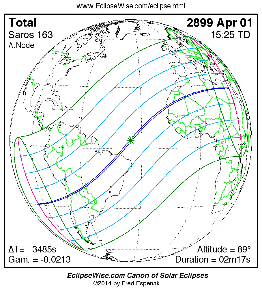 The instant of greatest eclipse takes place on 2899 Apr 01 at 15:24:30 TD (14:26:25 UT1).