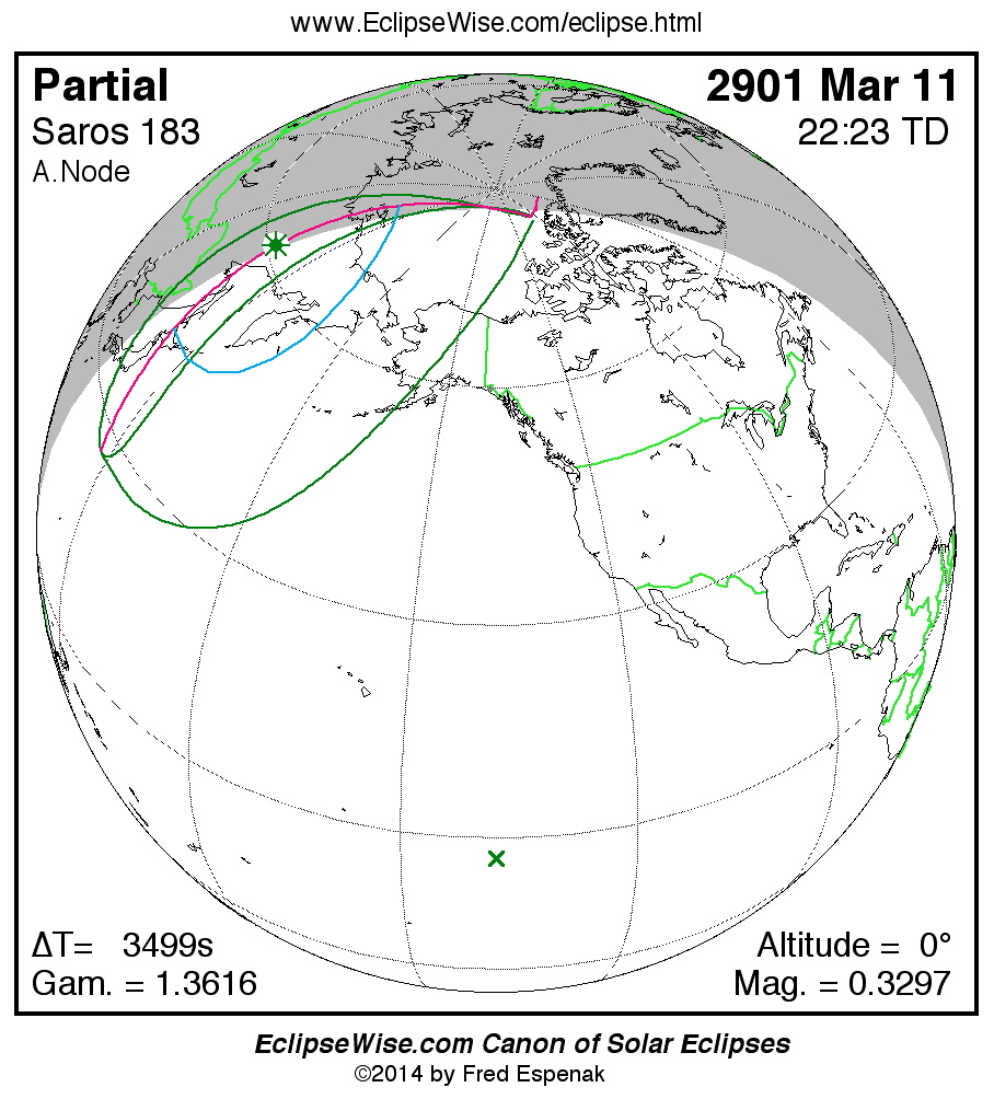 The instant of greatest eclipse takes place on 2901 Mar 11 at 22:22:31 TD (21:24:12 UT1).