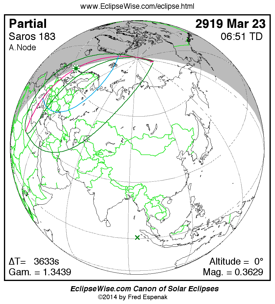 The instant of greatest eclipse takes place on 2919 Mar 23 at 06:50:53 TD (05:50:20 UT1).