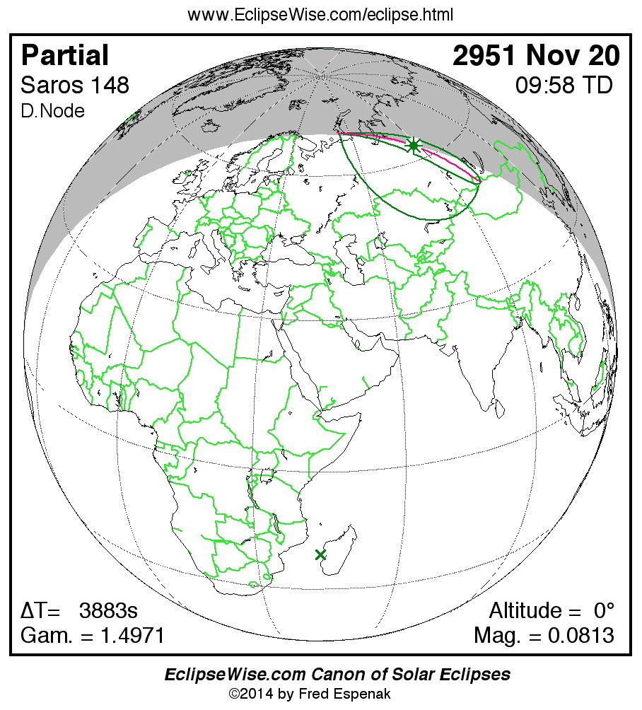 Another solar eclipse occurs one synodic month after the 2951 Nov 20 eclipse. It is the partial solar eclipse of 2951 Dec 19.
