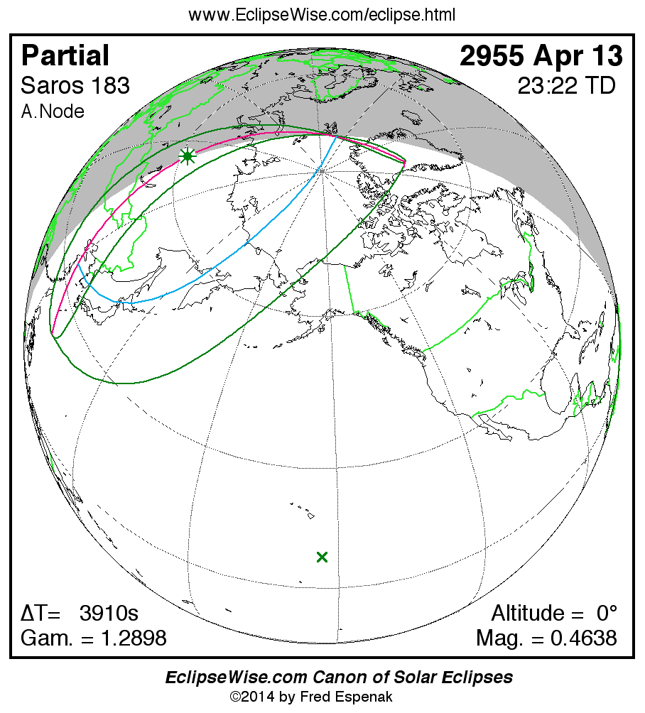 The instant of greatest eclipse takes place on 2955 Apr 13 at 23:22:10 TD (22:17:01 UT1).
