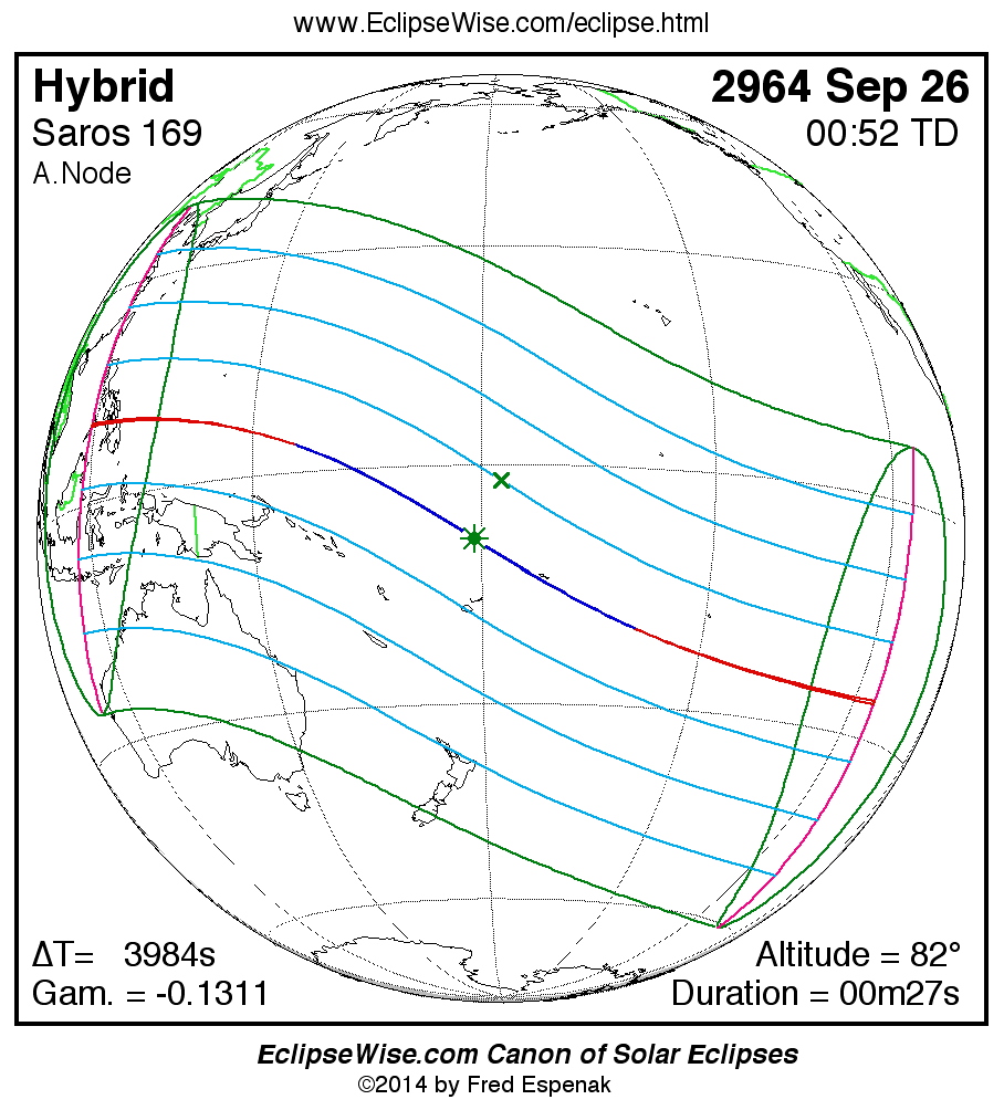 - Orthographic Map: Hybrid Solar Eclipse of 2964 Sep 27 - global map of eclipse visibility