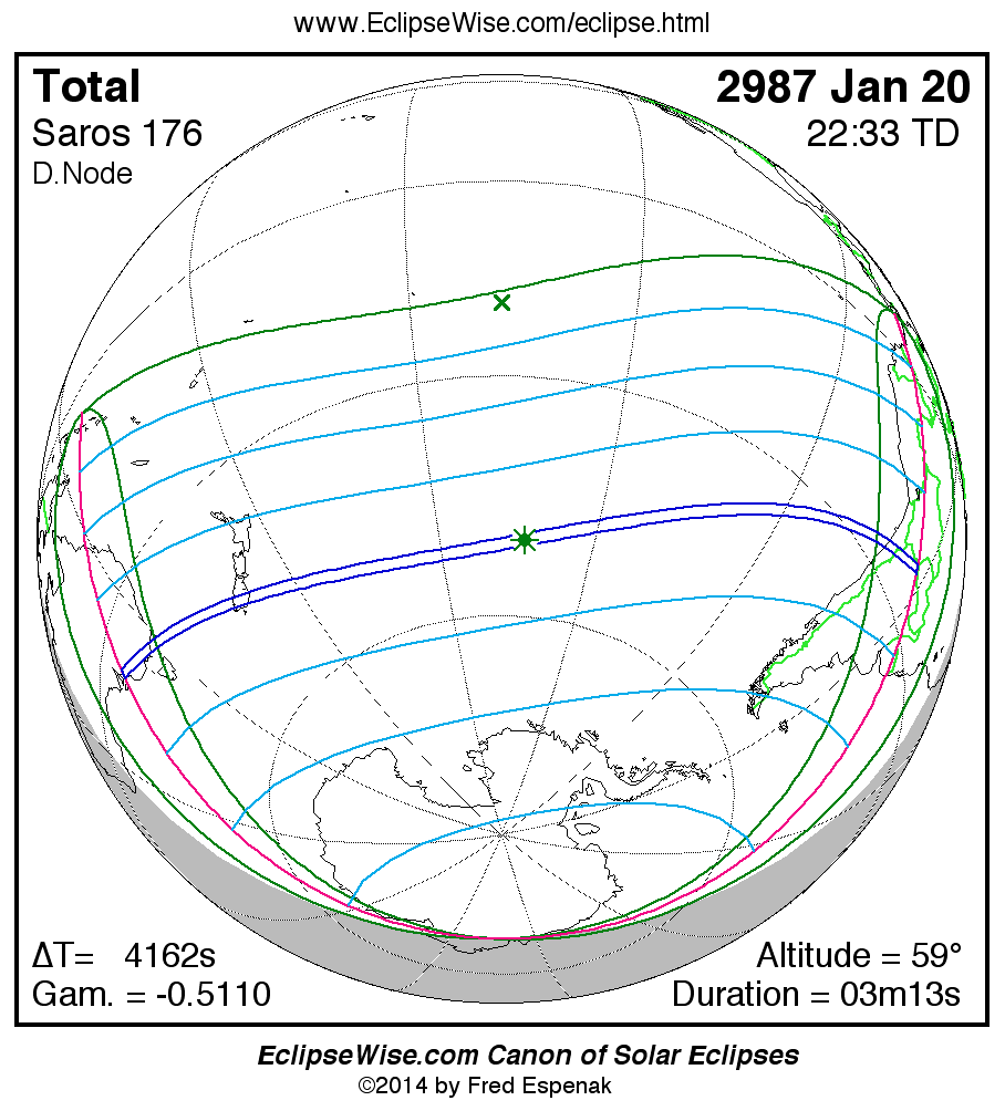 The instant of greatest eclipse takes place on 2987 Jan 20 at 22:33:19 TD (21:23:58 UT1).