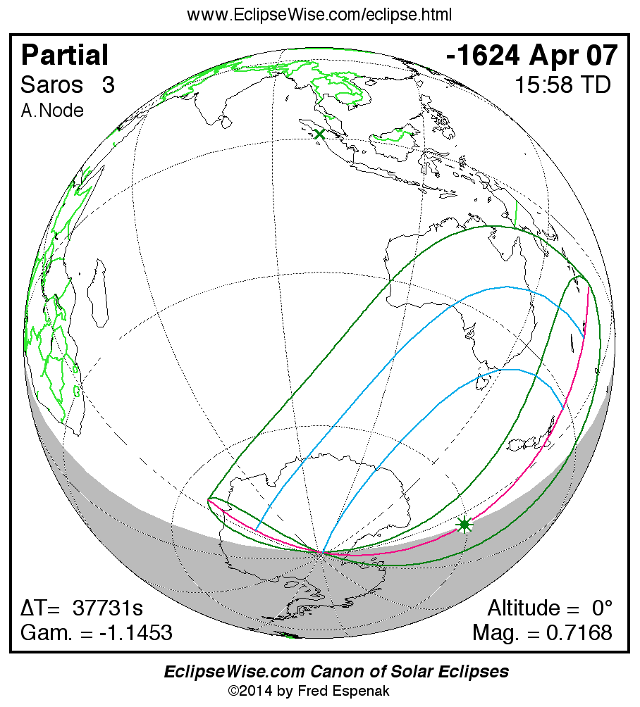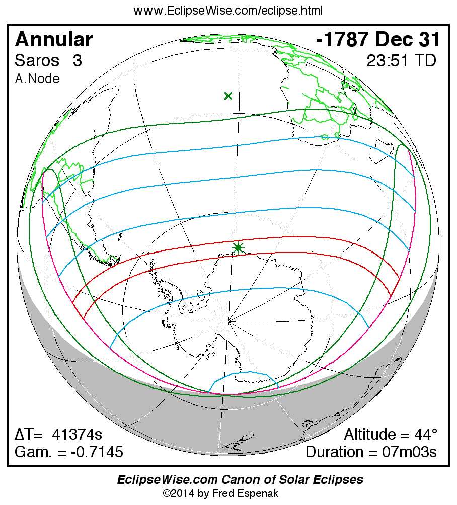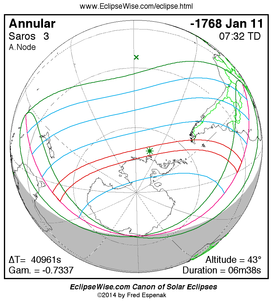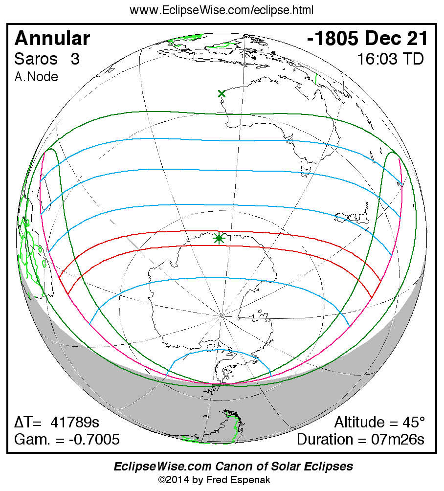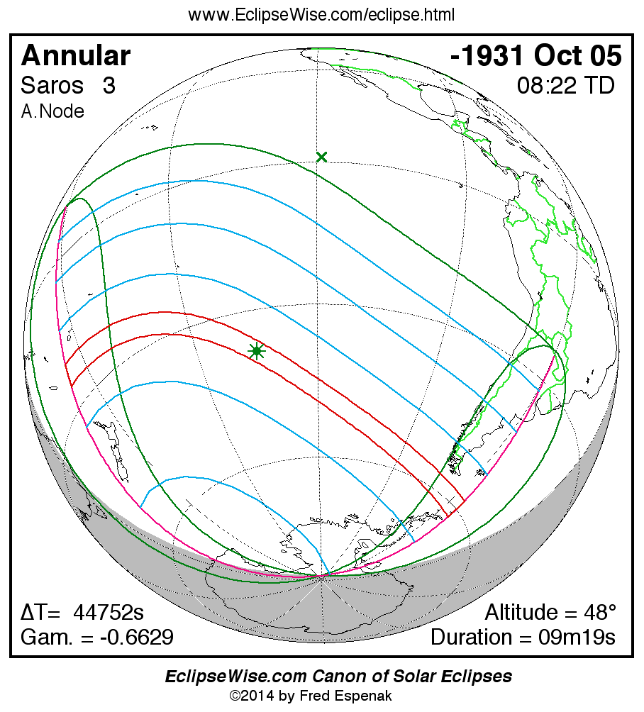 A panorama of all solar eclipses belonging to Saros 3 is presented here. Each map depicts the geographic region of visibility for a single eclipse. For central eclipses, the total or annular path is plotted in either blue (total) or red (annular). The date and time is given for the instant of Greatest Eclipse. Every map serves as a hyperlink to the EclipseWise Prime page for that eclipse where a larger map and complete details for the eclipse can be found. Visit the Key to Solar Eclipse Maps for a detailed explanation of these maps. Near the bottom of the page are a series of hyperlinks for more on solar eclipses.